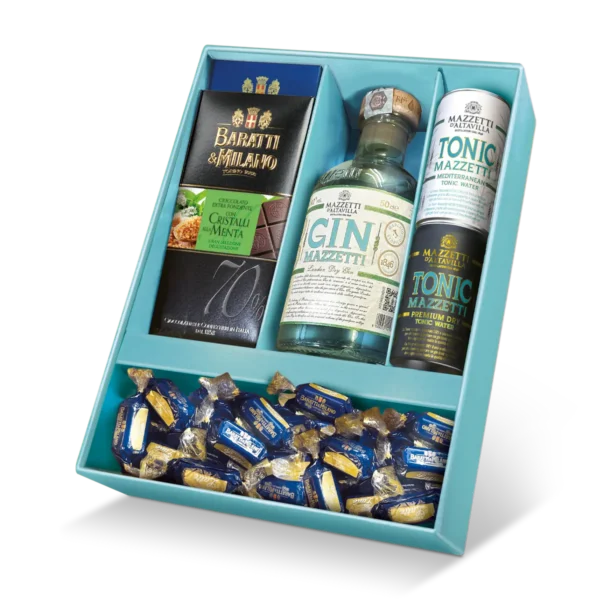 Un incontro esclusivo ed estremamente attuale tra una selezione di cioccolato Baratti e Milano e il Gin prodotto da Mazzetti d’Altavilla: note agrumate e botaniche che esaltano il cioccolato, presentato con la tavoletta Extra Fondente 70% con cristalli di menta, la tavoletta al latte con cristalli di caramello e morbide praline con ripieno al latte, in una confezione vivace e sorprendente.