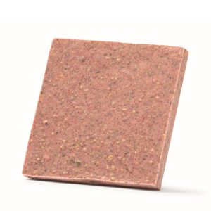 Cuore è una Mattonella quadrata di Cioccolato Bianco con Lamponi e Pistacchi in granella, con una romantica finestrella a forma di cuore per sbirciare il colore e la texture.