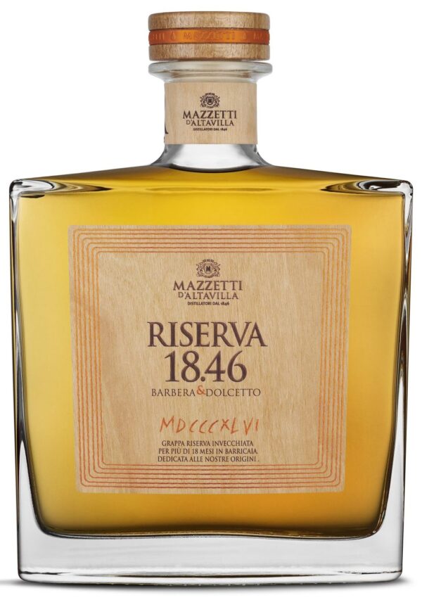 Distillato ottenuto dalle vinacce dei “rossi” Barbera e Dolcetto, fusi per creare un blend, in una perfetta sospensione, tutta da gustare, fra i profili secco e aromatico. Dal paziente invecchiamento in legni di pregio nasce Riserva 18.46, il prodotto di sapienti tagli di cantina il cui nome – oltre 18 mesi di invecchiamento nella batteria numero 46 – rimanda direttamente alla data di fondazione dell’azienda. Distillazione: con processo discontinuo e successivo invecchiamento per oltre dodici mesi in barriques di Rovere d’Allier. All’estrazione fa seguito l’assemblaggio e l’ulteriore affinamento per almeno sei mesi in botti di Castagno.