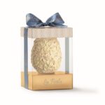 Il nuovo uovo di Pasqua firmato La Perla di Torino prende vita da una lavorazione artigianale “rocher” che ne esalta la ricetta esclusiva a base di cioccolato fondente con fave di cacao tostate e arancia. Confezionato in un elegante packaging che unisce i toni tenui dell’azzurro polvere al calore scintillante dell’oro e all’avorio. Confezionato a mano. Contiene sorpresa.