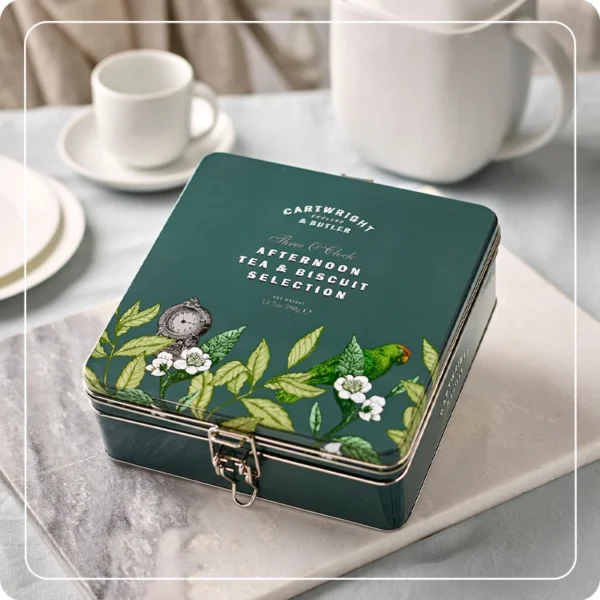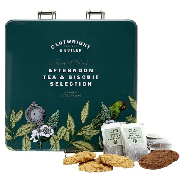Un elegantissimo set regalo firmato Cartwright & Butler. La scatola regalo – in latta – contiene golosi biscotti brownie al cioccolato e biscotti d’avena con pezzetti di caramello salato e del tè English Breakfast.