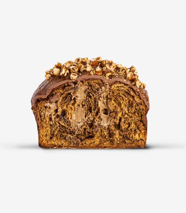 Questo panettone combina il gusto intenso del caffè con la dolcezza dello zucchero Carafin, zucchero candito dal sapore caramellato. L’impasto soffice al caffè è farcito con una crema al caffè e panna, mentre la copertura di nocciole aggiunge un piacevole tocco di croccantezza al palato.