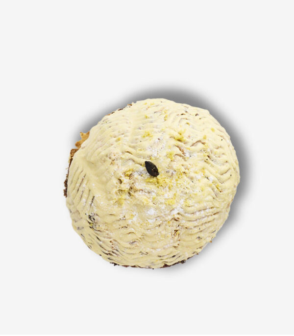 Farina di grano duro tipo “00”, burro, tuorlo d’uova, zucchero, acqua, grano cotto (grano, acqua, sale, correttore di acidità; E471; acido Citrico), canditi arancio, ricotta di pecora (latte, siero di latte, sale) Miele di acacia, pasta d’arancio, (scorza d’arancia, sciroppo di glucosio – fruttosio, zucchero, pasta di mandarino (scorza di mandarino, sciroppo di glucosio – fruttosio, zucchero), sale, malto d’orzo. decorazione: farina di grano duro tipo “00”, zucchero, uova, aroma cannella.