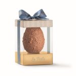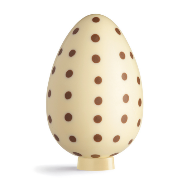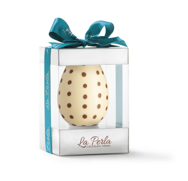 Dolce e avvolgente, l’uovo di cioccolato bianco con gli eleganti pois di cioccolato al latte conquista tutti con un abbraccio di pura scioglievolezza. Decorato e confezionato a mano. Contiene sorpresa.