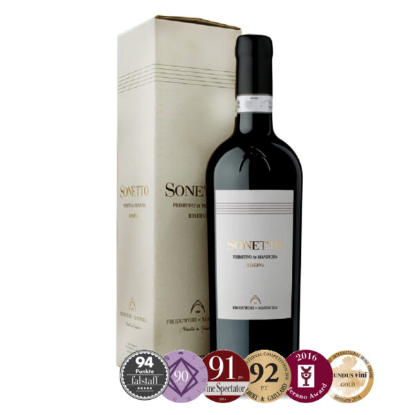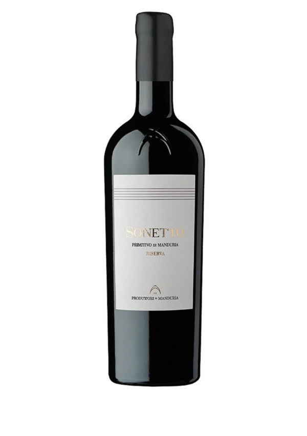 Il Primitivo di Manduria Riserva “Sonetto” della cantina Produttori di Manduria è un vino rosso ricco, fruttato e muscoloso prodotto a Manduria, in quella parte di Puglia, il Salento Settentrionale, che si affaccia sul Mar Ionio. Il “Sonetto” è un cru ottenuto da uve Primitivo in purezza attentamente selezionate e provenienti da vecchie vigne, di un’età compresa tra i 50 e i 70 anni, allevate con il metodo ad alberello pugliese. La cantina Produttori di Manduria, nata nel 1932, rappresenta uno dei primi esempi di cooperativa agricola del settore vitivinicolo nel Mezzogiorno e può contare su 400 soci e circa 900 ettari vitati.