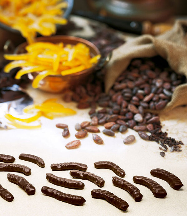 Filetti di arancia canditi ricoperti di finissimo cioccolato fondente (cacao 60% min.)