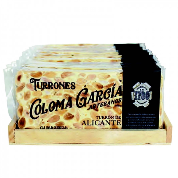 Per il disciplinare del Torrone di Alicante, le mandorle devono essere almeno il 46% (questo di Coloma Garcia arriva addirittura al 67%) e vengono leggermente tostate in tamburi rotanti, chiamati boixets: raggiunto il punto di tostatura desiderato si aggiungono albume d’uovo diluito e miele di rosmarino fino a che non si crea una amalgama fluida e compatta. Successivamente la massa ricavata viene versata in stampi circolari e ricoperti da ostie: delicatezza e croccantezza per un prodotto unico e impareggiabile.