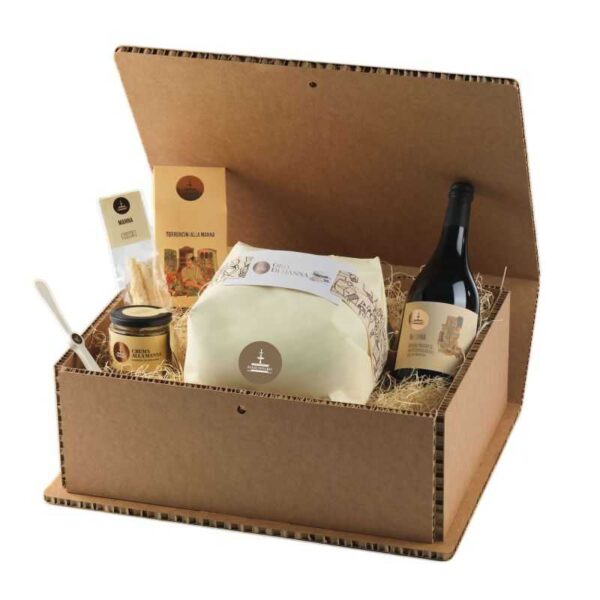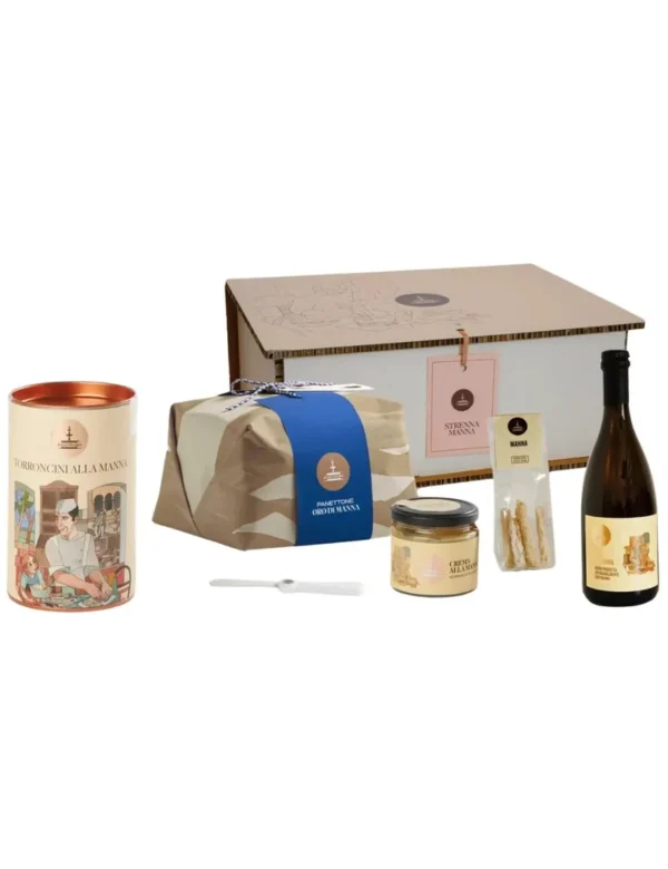 La confezione contiene, un panettone Oro di Manna, un vasetto di Crema spalmabile alla Manna, una confezione di torroncini alla manna, una confezione di cannoli di manna, uno spalmino Fiasconaro e una bottiglia di birra alla manna da 75cl.
