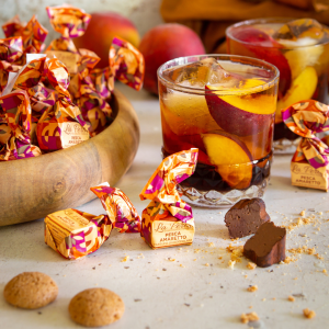 In questo piccolo, goloso dessert, cioccolato fondente e cioccolato a latte avvolgono le note della pesca ed esaltano il sapore tipico dell’amaretto, per una freschezza senza fine.