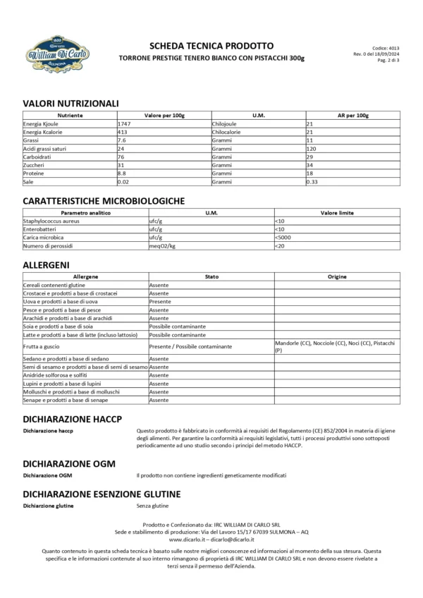 Torrone Bianco con Pistacchi William Di Carlo Linea Prestige 300g
