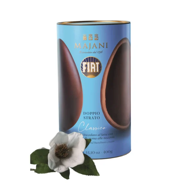 Uovo bi-strato con un guscio di finissimo cioccolato al latte extra e uno strato di crema Fiat. Con sorpresa. L’uovo si veste di una raffinata confezione regalo impreziosita da un nastro in raso blu.
